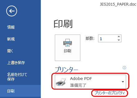 2. プリンタを「AdobePDF」に変更し、プロパティをクリックします。