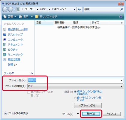 2. ここで [ファイルの種類] を [PDF] にして、ファイル名を指定して、[発行] をクリックします。(最適化は「標準」を選択してください)
