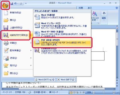 - ワード2007で文書を開いたら、[Office] ボタンをクリックして、[名前を付けて保存] の [PDF または XPS] をクリックします。